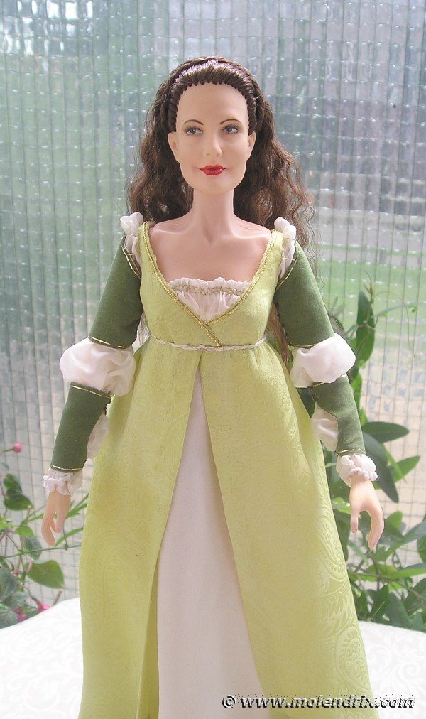 - Sleeves are very wide and long, gathered in the armholes, then they are twice gathered above doll's elbow, once just under elbow, and then on the wrist with a fine white rubber thread. Gauntlets have sides sewn together with a black rubber thread, so it looks like the lacing. The lower gauntlets are closed with tiny hook and eye at the wrist. The upper gauntlets are tied to the gown with a golden bullion.