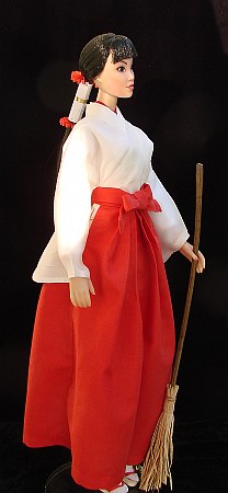 priests or helping visitors or cleaning the courtyard of the shrine.... Their typical costume consists of the plain white kimono, called kosode and of the bright red trousers or the pleated skirt, called hakama. Although the outfit looks very striking and elegant, it was originally the women's underwear of Heian period. The ponytail of miko is adorned with paper ribbons. This costume is very popular among fans of manga and cosplayers. My Reiko was originally 16" Koko by Butterfly Ring (I renamed her, because koko means "a hen's cackle" here :-)), I repainted her and made the longer wig for her (ventilating method). The trousers from a red cotton poplin have the low placed crotch, so the kimono can be tucked inside, and the fastens with a pair of ties at waist. The off-white kimono is from a starched twill, under the kimono is also the white cotton undershirt with narrow sleeves, and the separate red collar. She has white socks and sandals from balsa wood (taken from a wicker rack). The broom was made from a piece of a dry stem and from a natural bast. |