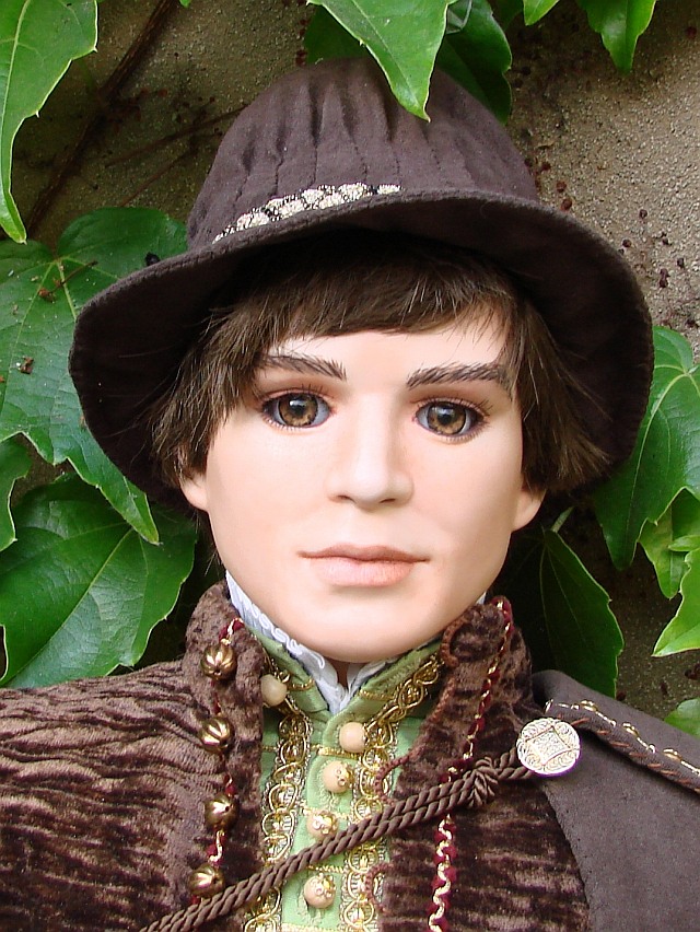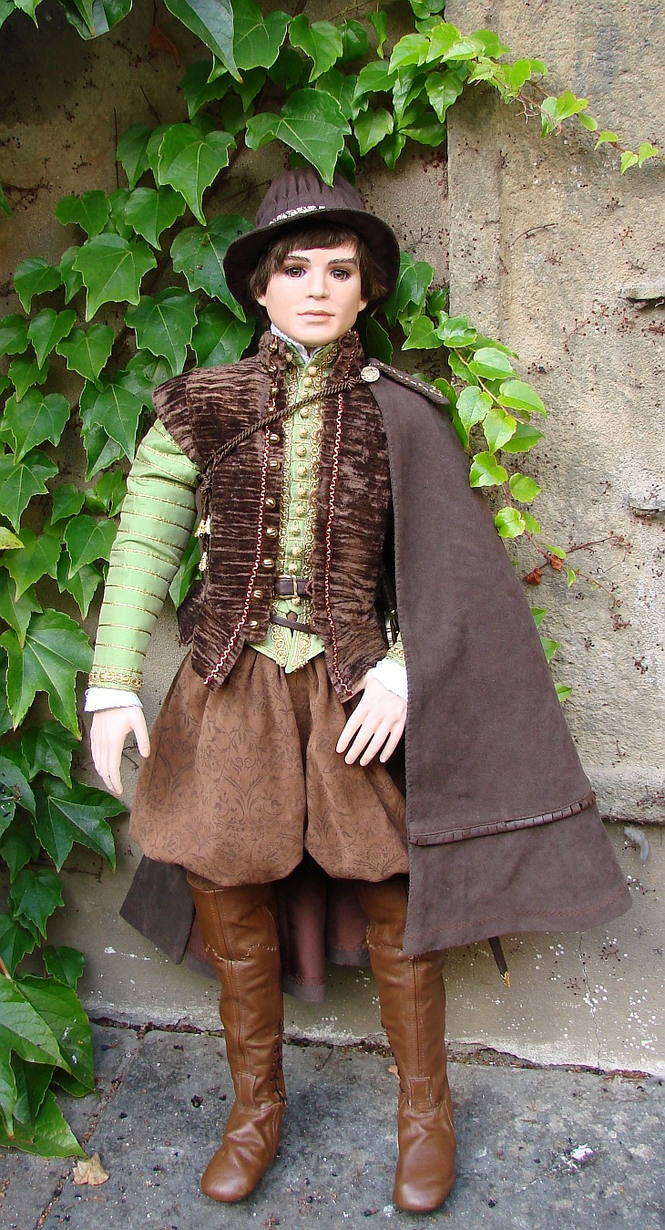 zakončovacím lakem. Když byl Roger konečně oblečený, obutý, ozbrojený a zmalovaný, vyfotografovala jsem ho na jednom pražském nádvoří, a na cestě domů ho upustila tak nešťastně, že jeho hezká hlava nevydržela. Naštěstí paní Warren byla ochotná mi novou hlavu odlít... Původně jsem ho chtěla obléct jako mušketýra, ale když jsem spatřila na Costumer's Guide Cliva Owena v roli sira Waltera Raleigha, rychle jsem změnila názor. Byla to další výzva - obléct ho do pozdně renesančního oděvu španělského typu. Hodně pomohly knížky od Ninyi Mikhaily a Janet Arnold. Kostým je tak na 50% šitý na stroji. |