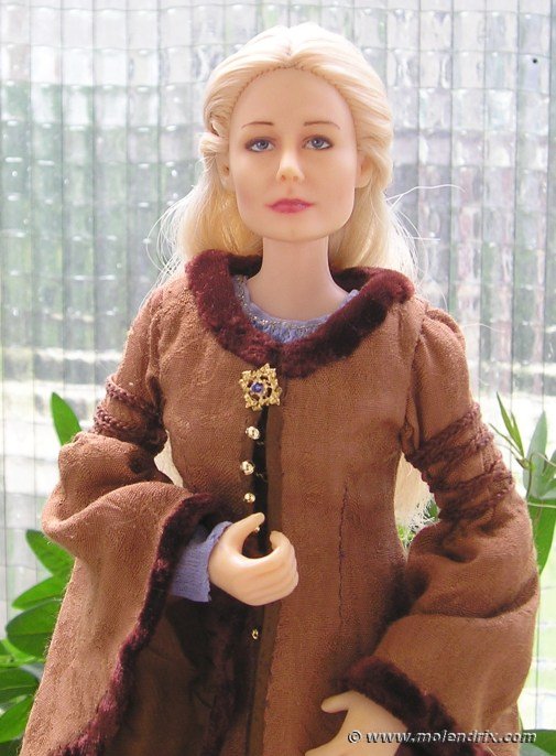The neckline, sleeves and hem of the skirt is trimmed with a brown velvet as a faux fur. The coat is closed in the front with row of miniature wire hooks and eyes. Golden beads imitate the buttons. The whole coat is lined, and except the sleeves is interlined with a vlieseline. The sleeves are entwined with crocheted brown ties, their ends are fastened with tiny wire hooks, set in the armpits.