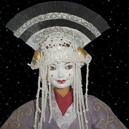 - To the outfit belong a fancy fan-shaped headdress with golden earflaps and strings of pearls. The detachable hairpiece is also interlaced with strings of pearls.