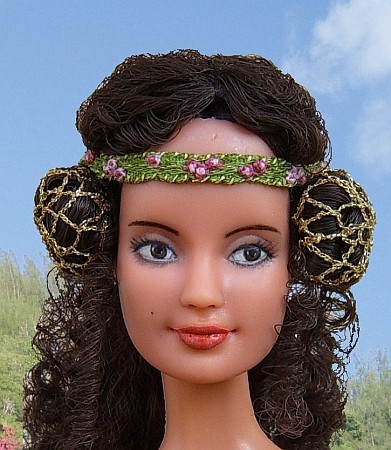 detachable hairpieces in golden crocheted snoods and the white court shoes with