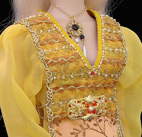 Inara Serra from Firefly TV series and fashion designs by Thea Parker The caftan for 16" Tyler Wentworth is A-shaped and fastens back with a zipper. The front top is covered with a yellow organza, chenille trims, embroidered and beaded. The bottoms of the brocade parts is weighten with lead beads to hang down nicely. |