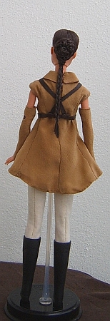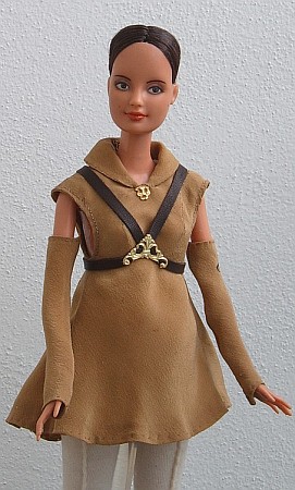 To the outfit belong pair of bias cutted long gauntlets. On the gauntlet of her upper left arm is painted Padmé's crest. The braided bun with long hanging braid is removable. The high boots are by Mattel, I removed only the relief "B" from them.